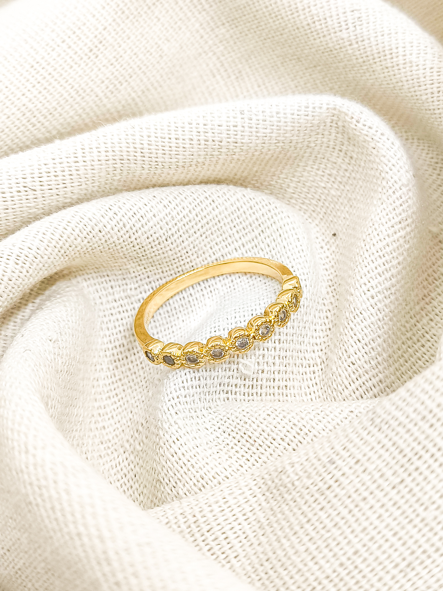 Anel em banho de ouro 18k, modelo aparador com 1 fileira de cravação de zircônias redondas.
