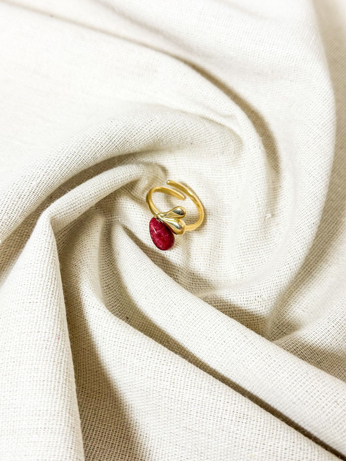 Anel banho de ouro 18k, coração liso com pedra natural Hawolita. Tamanho regulável.