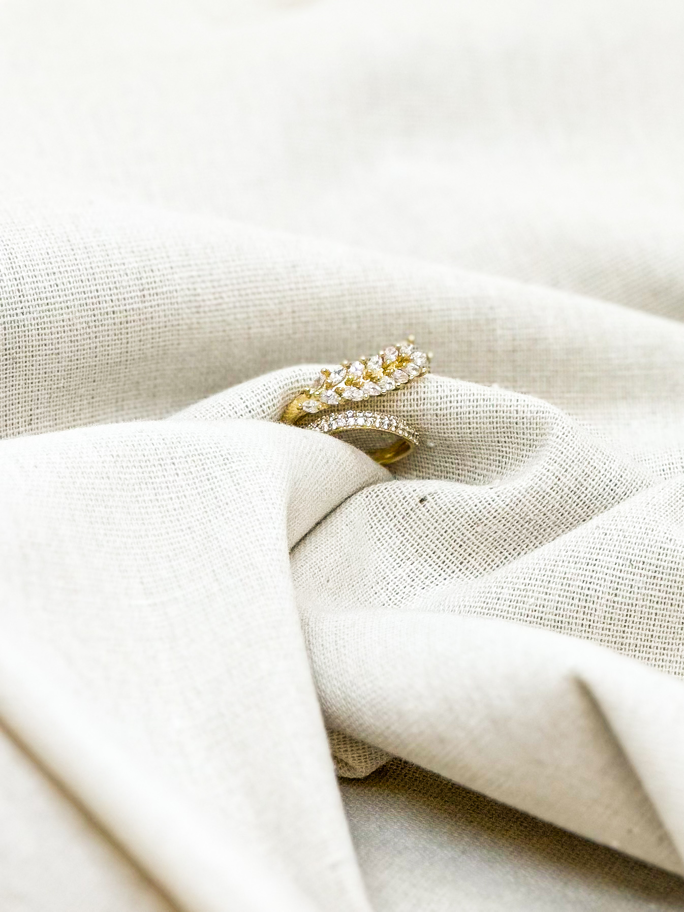 Anel em banho de ouro 18k, 2 aros cravejados em zircônias brancas, sendo um em formato de ramo