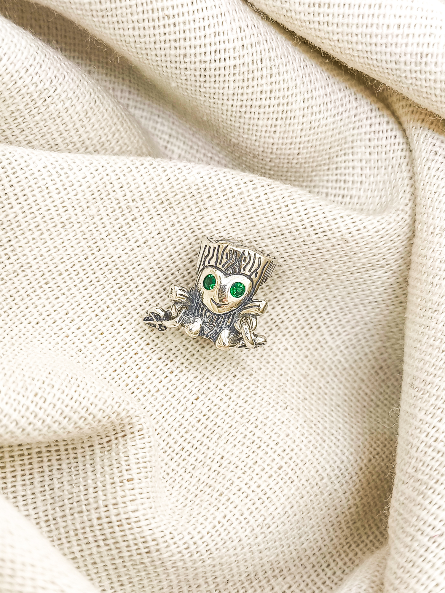 Berloque Groot ( Guardiões da Galáxia ) em prata 925, olhos com zircônias verdes com folhas suspensas nos bracinhos.