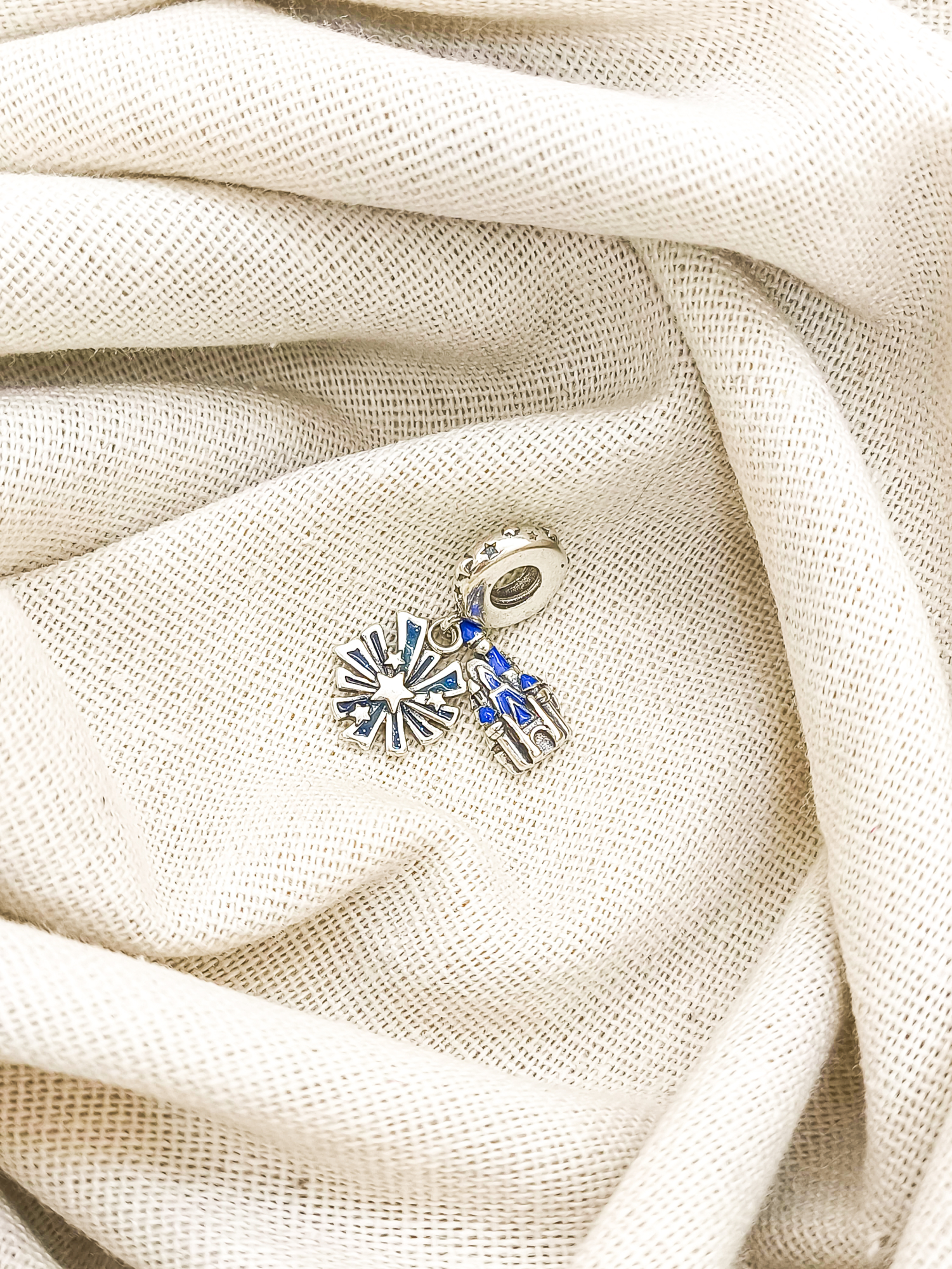 Berloque em prata 925 com 2 pingentes, sendo um do Castelo da Disney e outro de Estrelas.