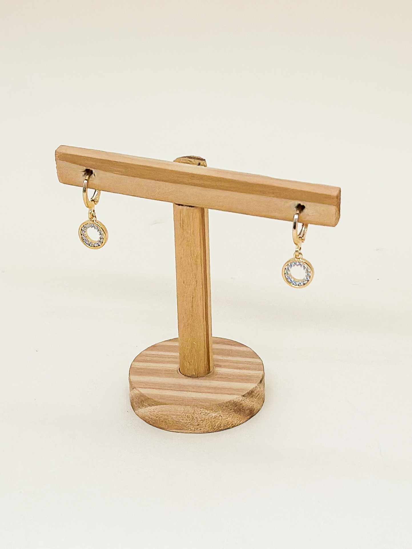 Argola articulada em banho de ouro / prata leve com pingente circular cravejado vazado.