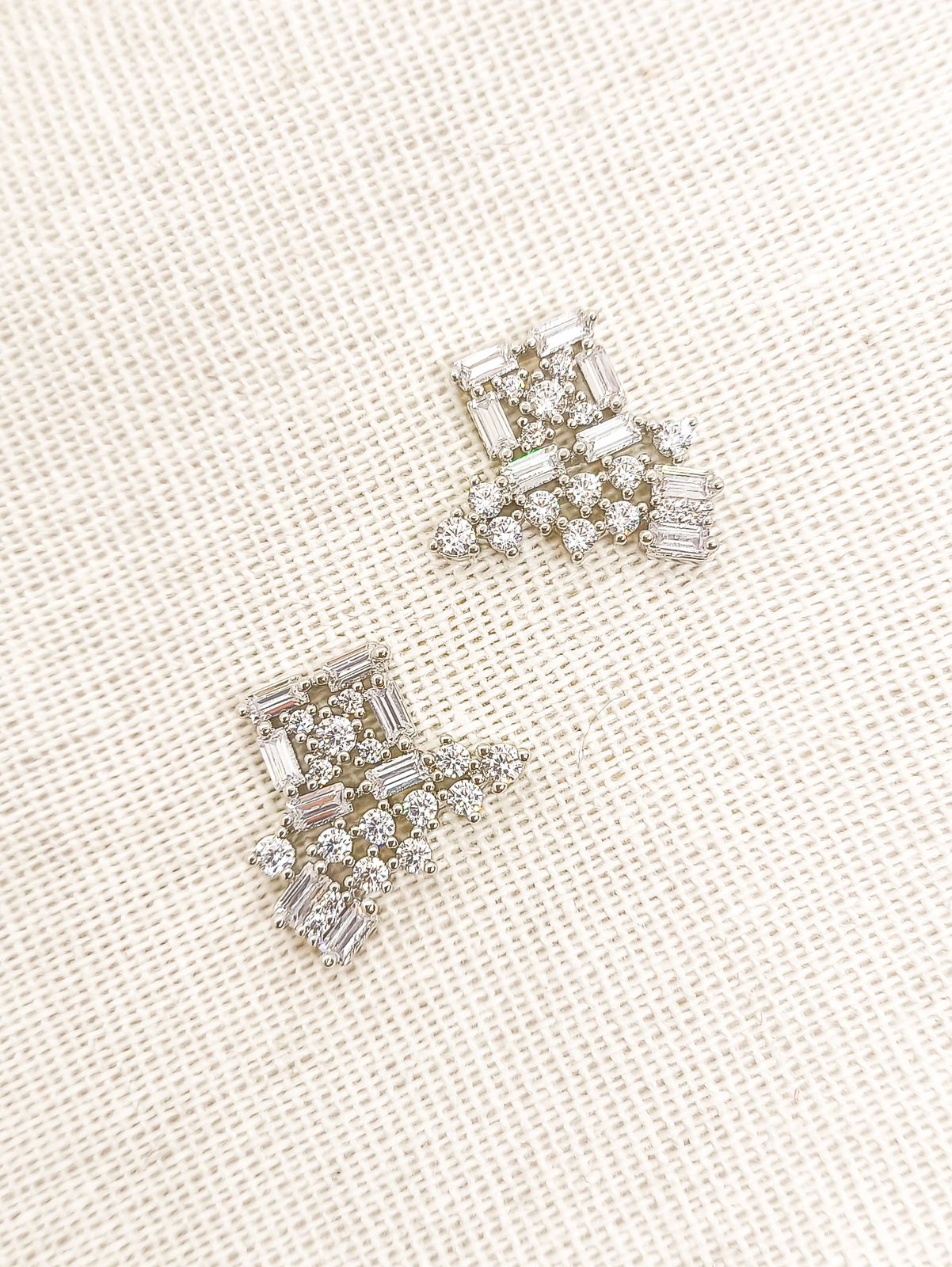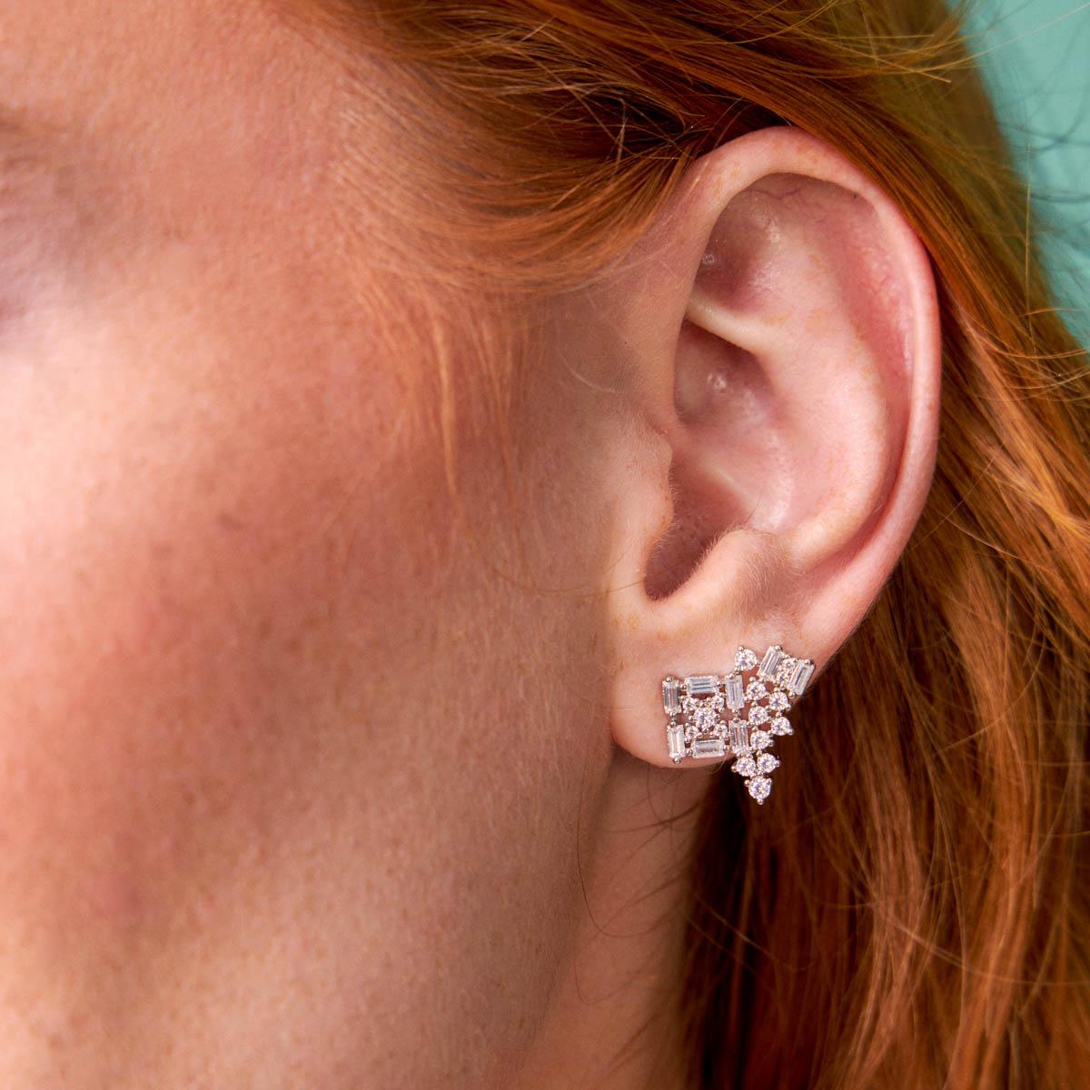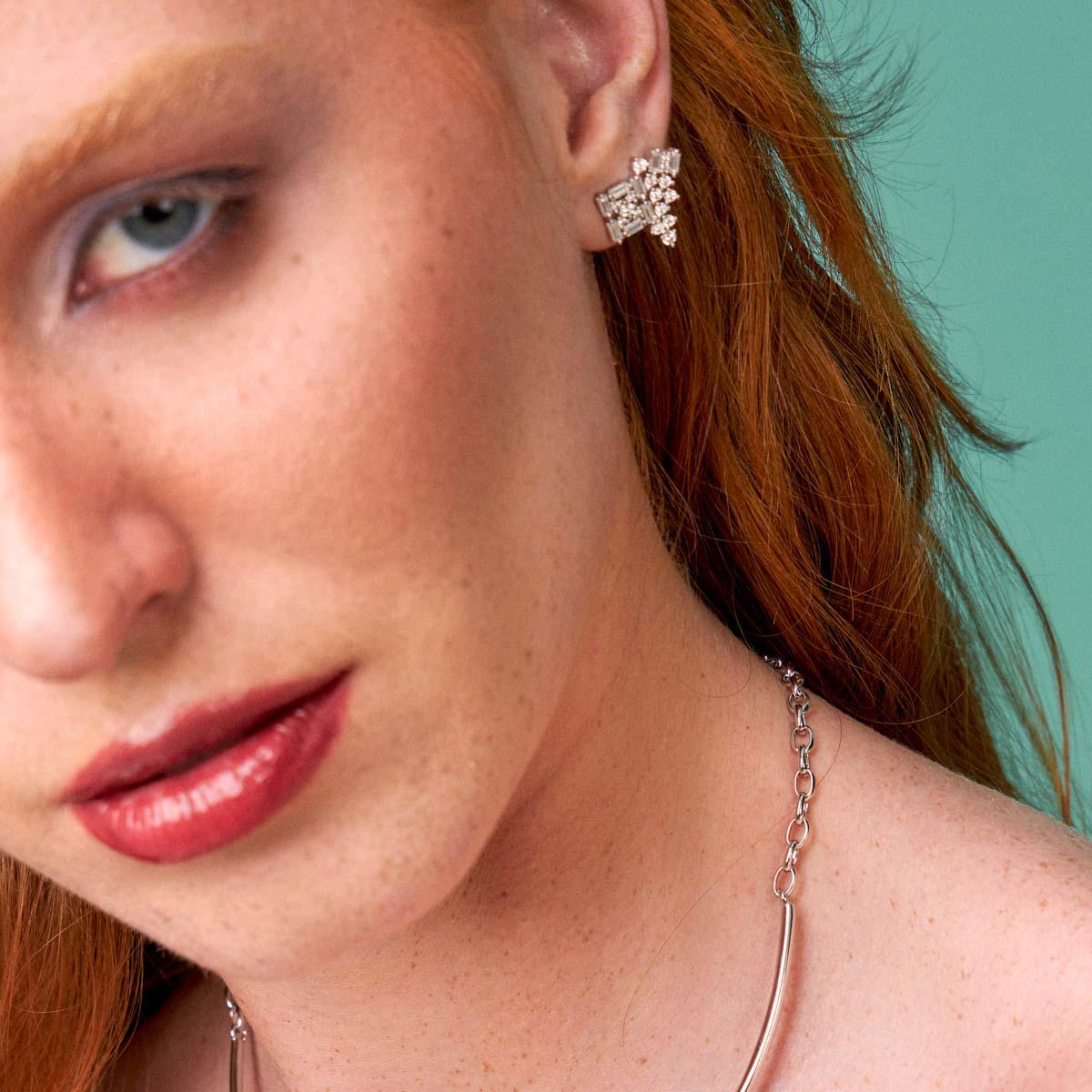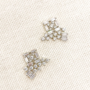 Brinco em banho de ródio branco, com cristais baguetes e redondos.