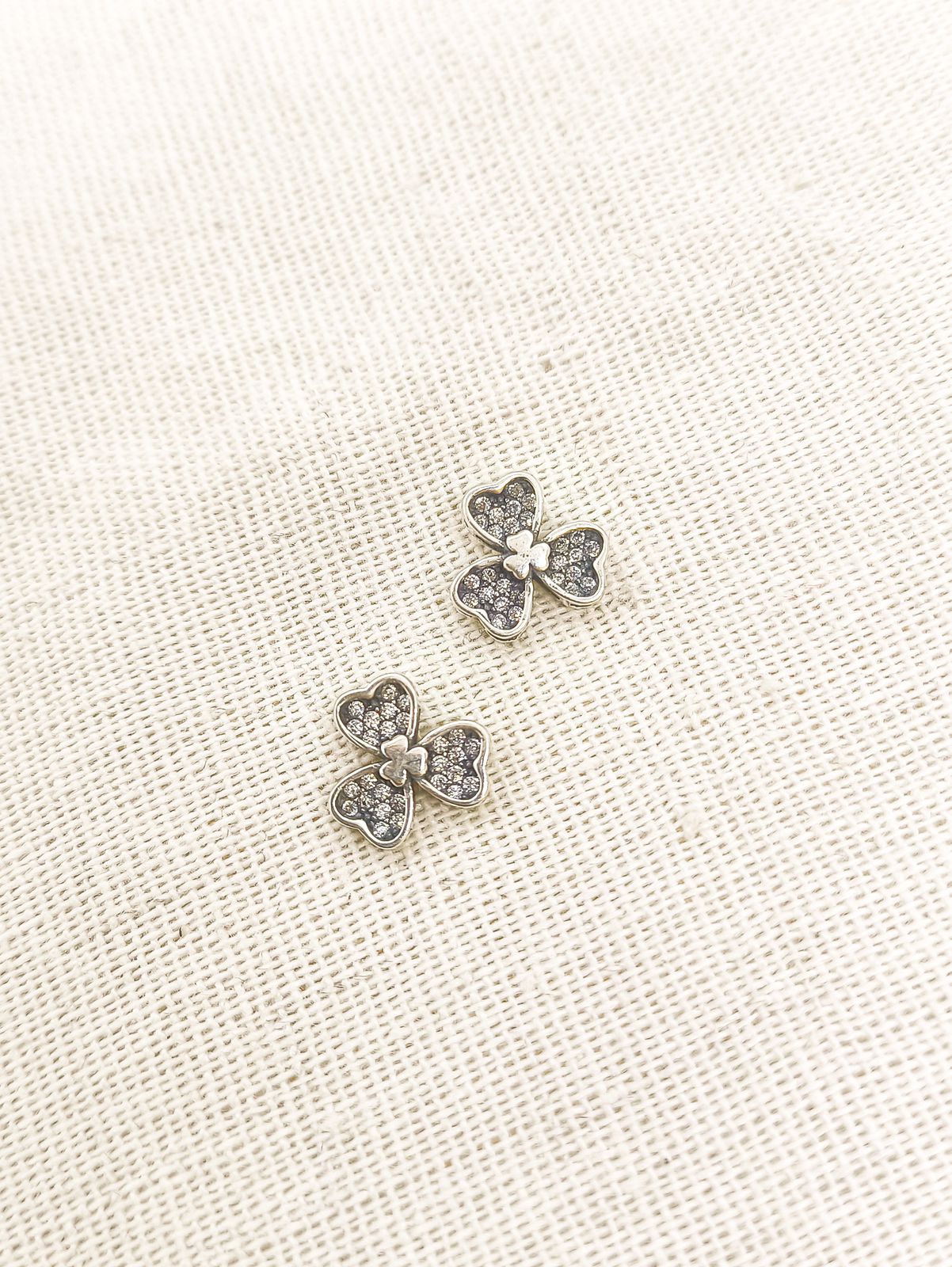 Brinco em prata 925, trevo vazado, cravejado em zircônias brancas.