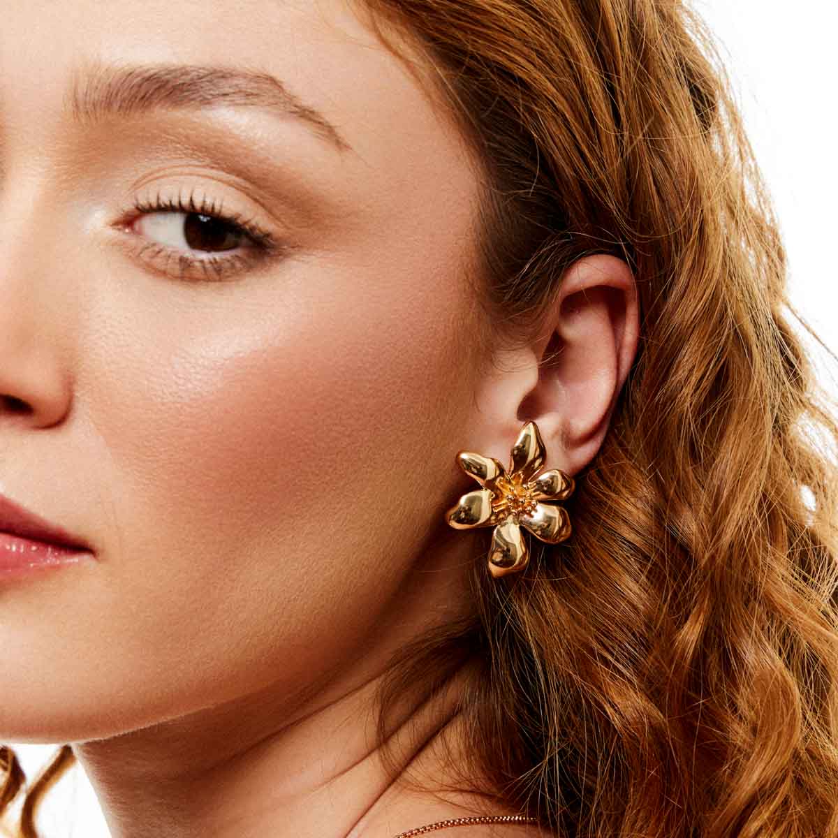 Brinco Flor de Hibisco em banho de ouro 18K com detalhe de bolinha no centro.