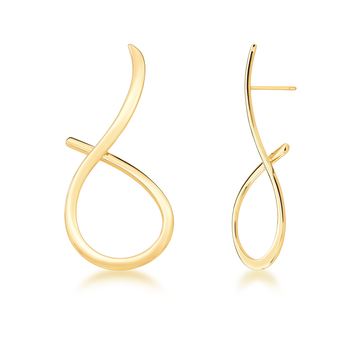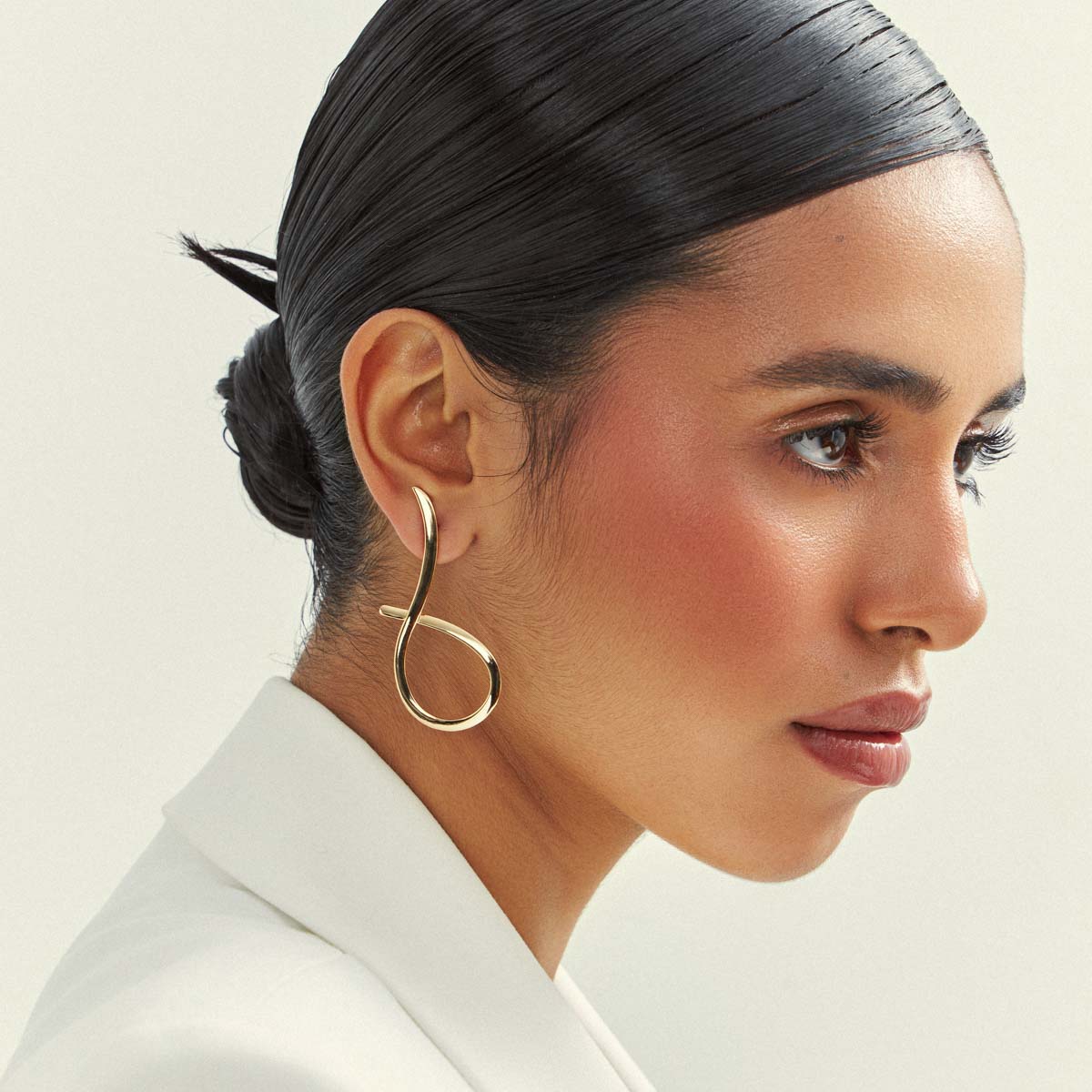 Brinco em banho de ouro 18 K, em formato fluído e liso, remete ao símbolo eterno. Tamanho: 6 cm.