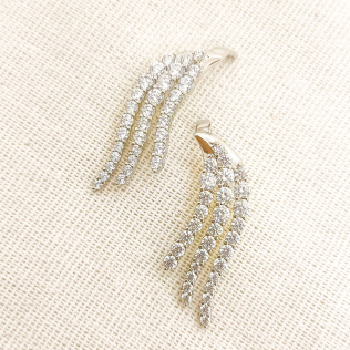 Brinco curvo cravejado de zircônias banhado em ródio branco.