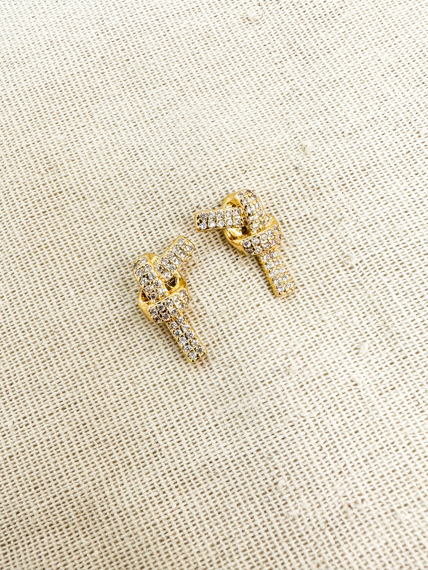 Brinco em banho de ouro 18k, 1 haste com 2 linhas de microcravação em zircônias brancas em formato de nó. Tamanho: 2cm de altura.