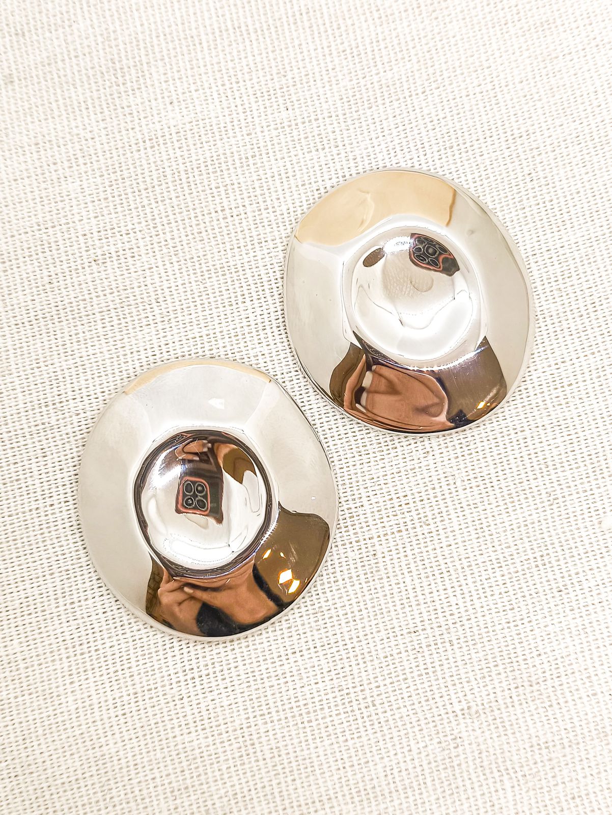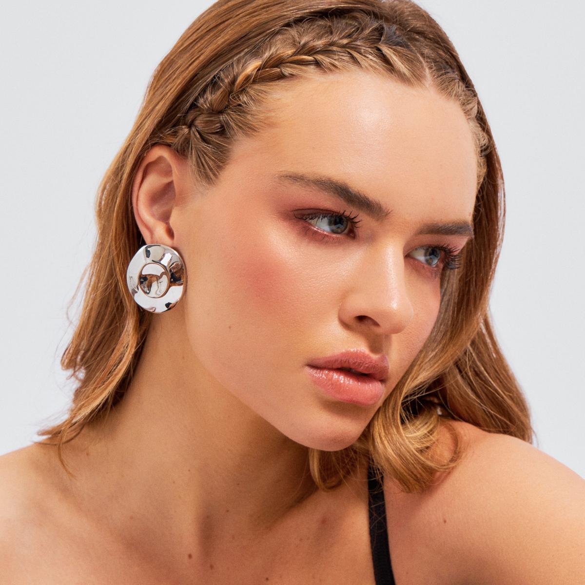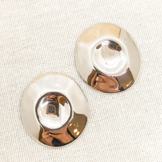 Brinco em banho de ródio branco, em formato oval, liso e martelado.