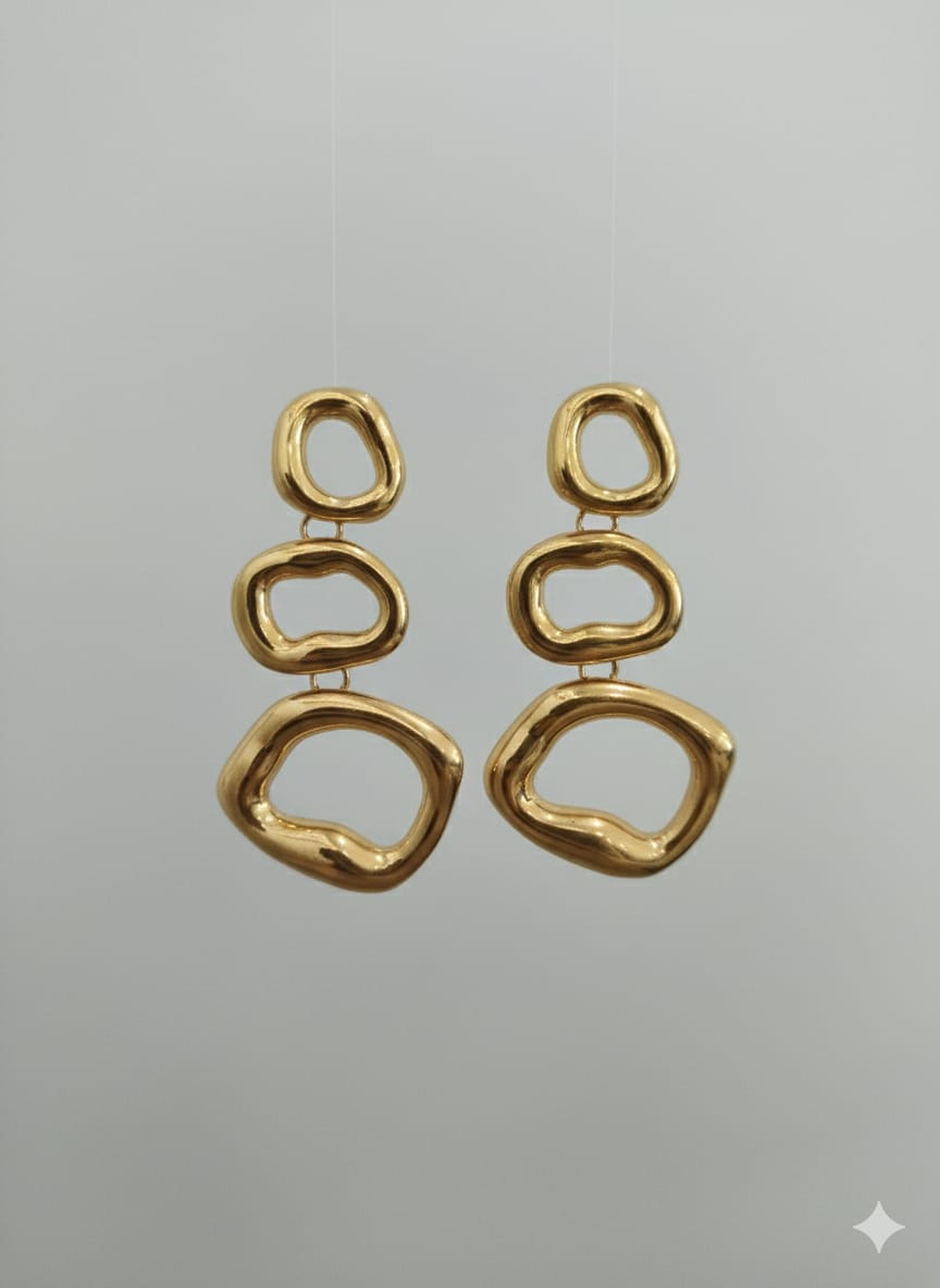 Brinco em banho de ouro 18K com 3 esferas orgânicas vazadas pêndulas.