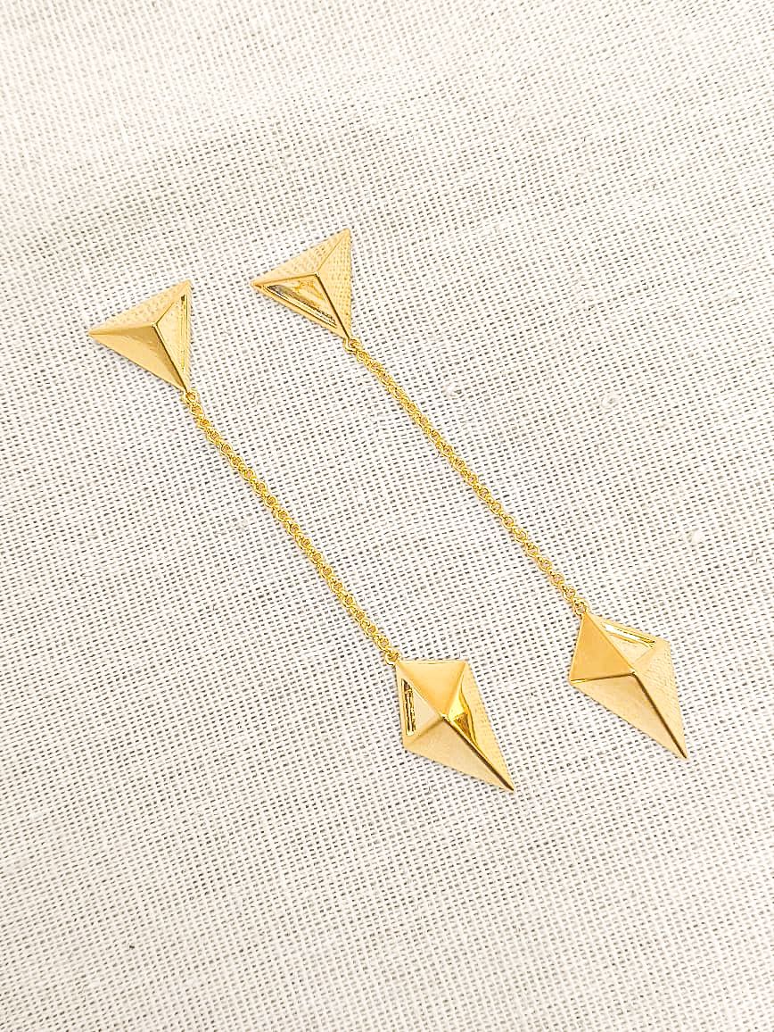Brinco em banho de ouro 18k, triângulo na base, com pêndulo geométrico.