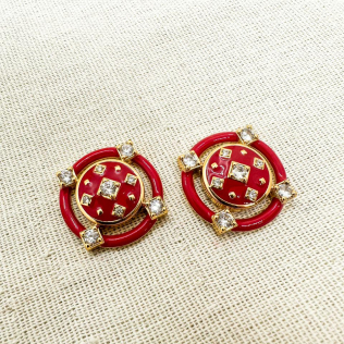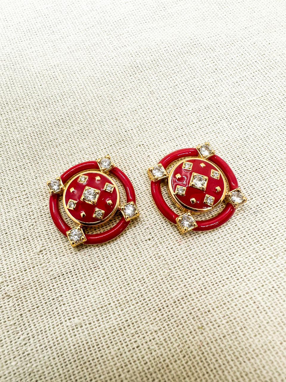 Brinco em banho de ouro 18 k, resinado vermlho, com cravações em zircônia branca.
