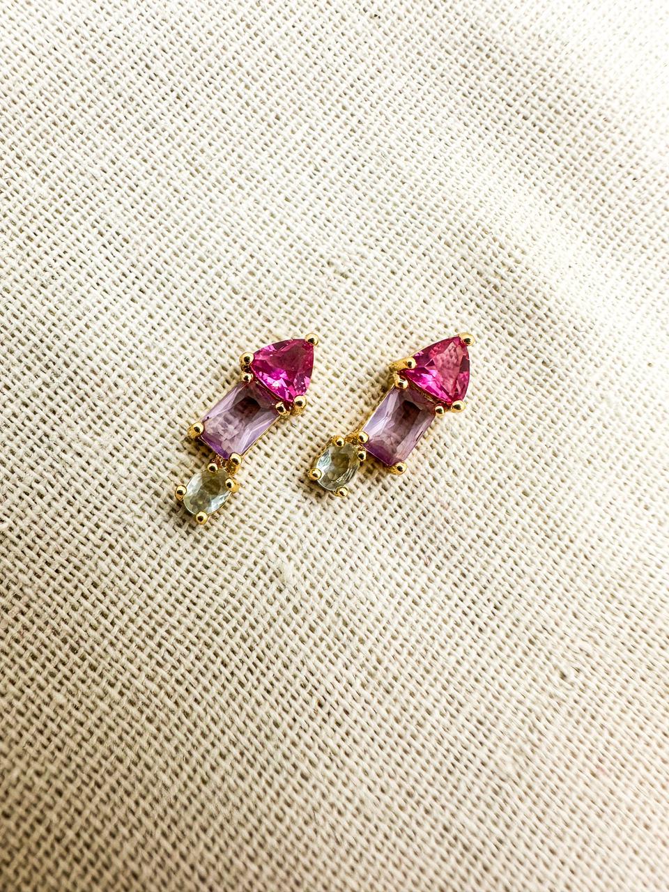 Brinco em banho de ouro 18 k, modelo Earcuff geométrico cristais pink, lilás e azul.