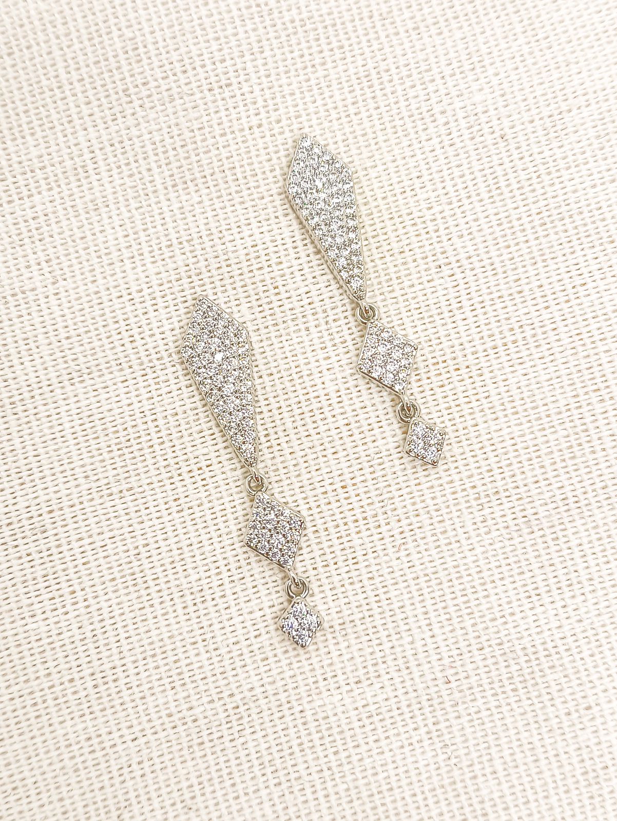 Brinco pêndulo geometrico cravejado de zircônias, em banho de ródio branco.