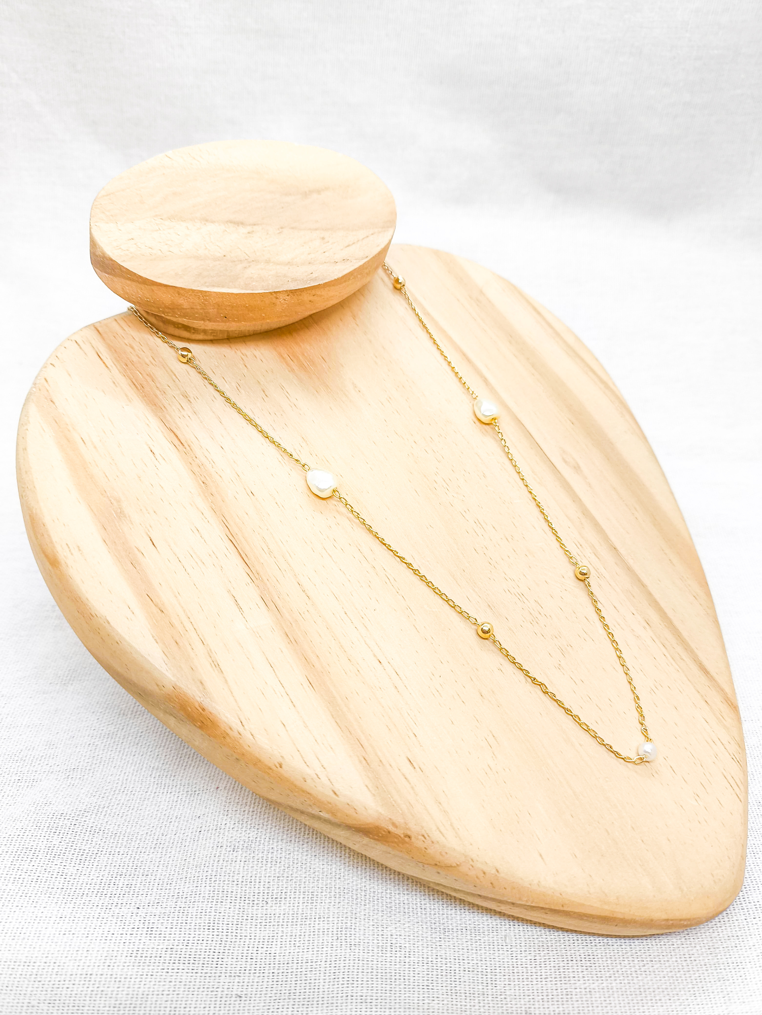 Cordão em banho de ouro 18k, malha americana com 3 pérolas, 4 mini pérolas diesel. 9 bolinhas. Tamanho: 78cm de comprimento.