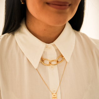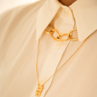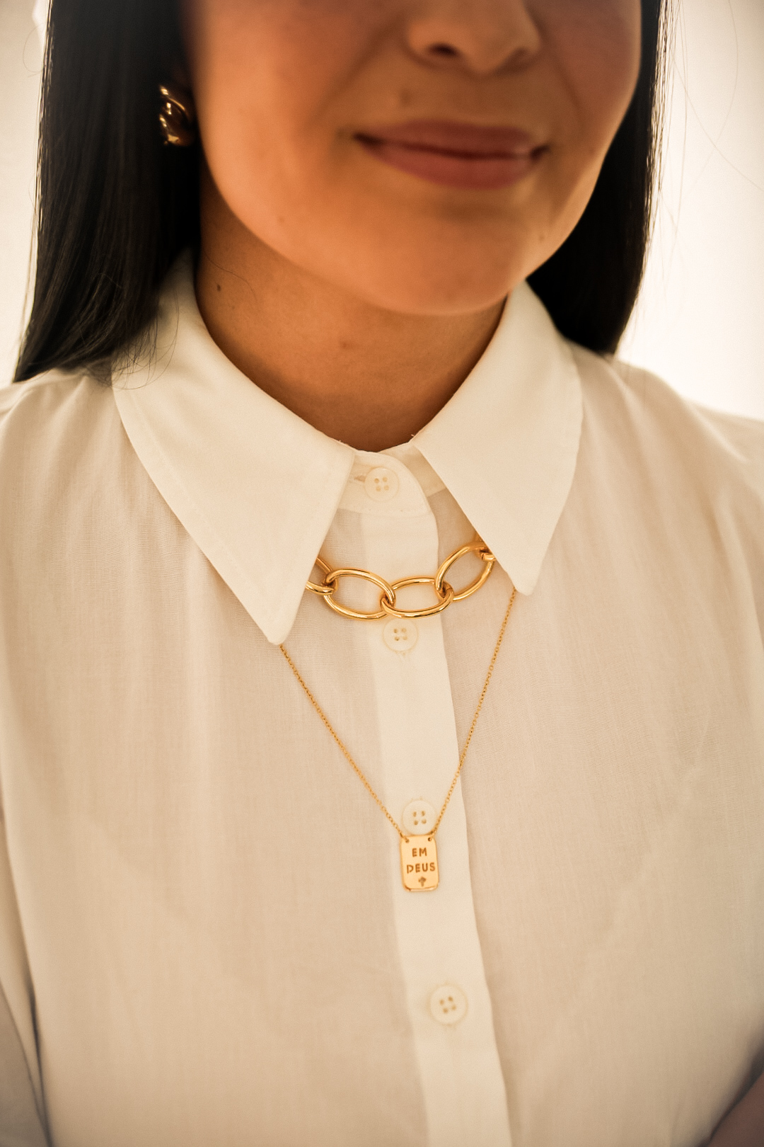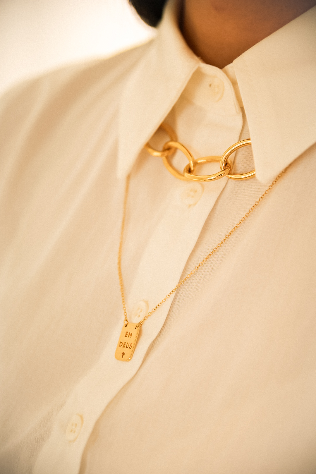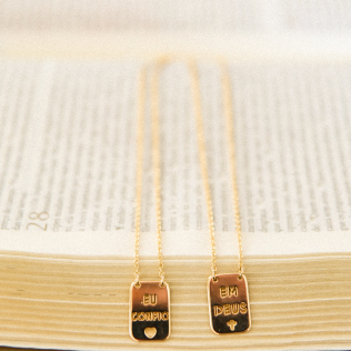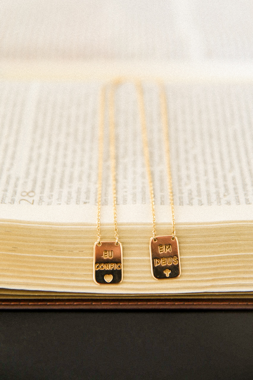 Escapulário em banho de ouro 18k, corrente elo americano com placa Em Deus com cruz vazado e a outra Eu confio com coração vazado.