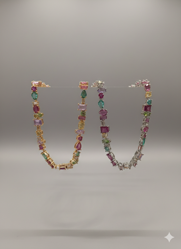 Corrente modelo Riviera, com cristais navete, redondo, quadrada e retangular, multicolors.