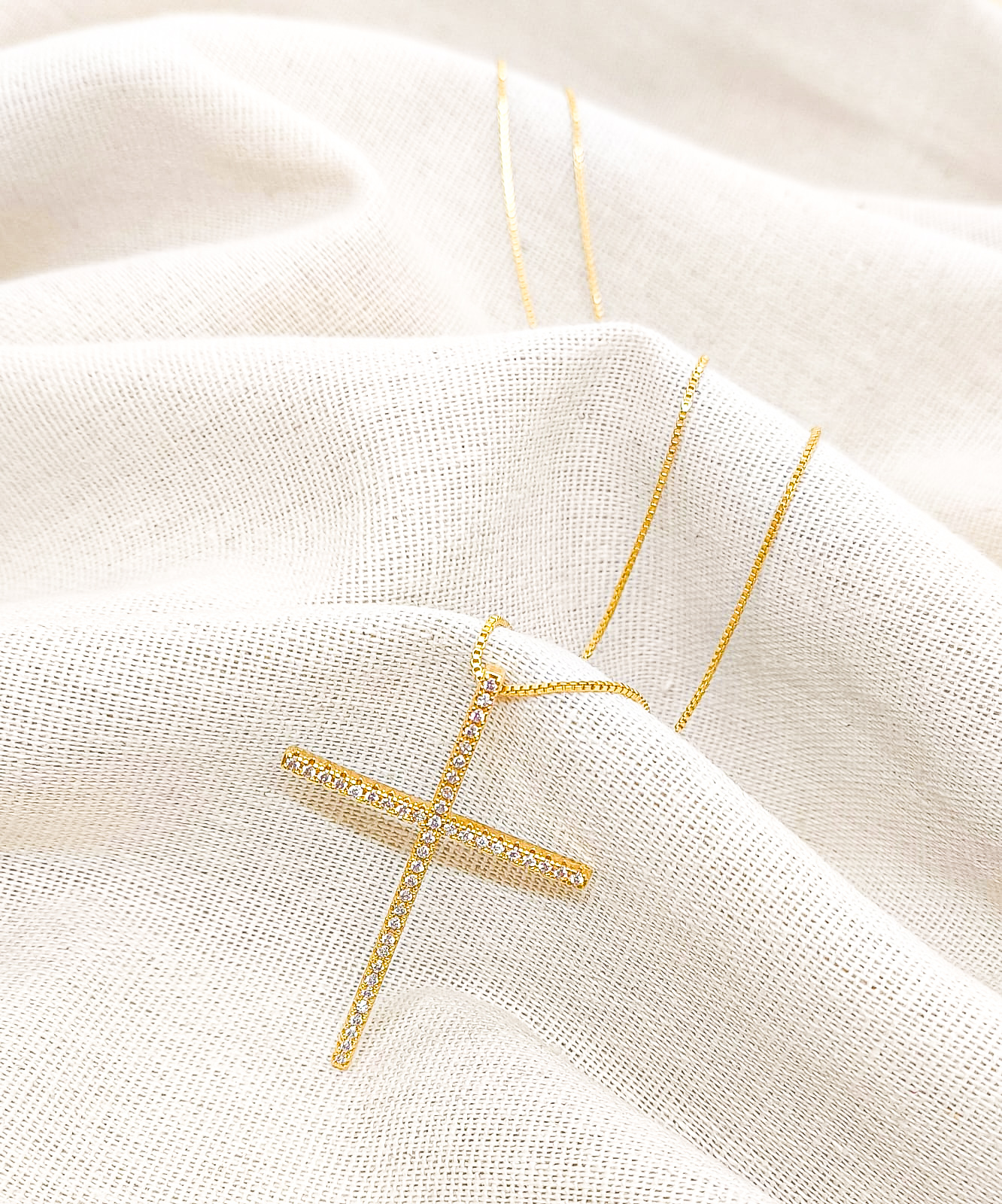 Pingente crucifixo modelo quadrado cravejado em banho de ouro 18K. OBS - Não acompanha corrente.