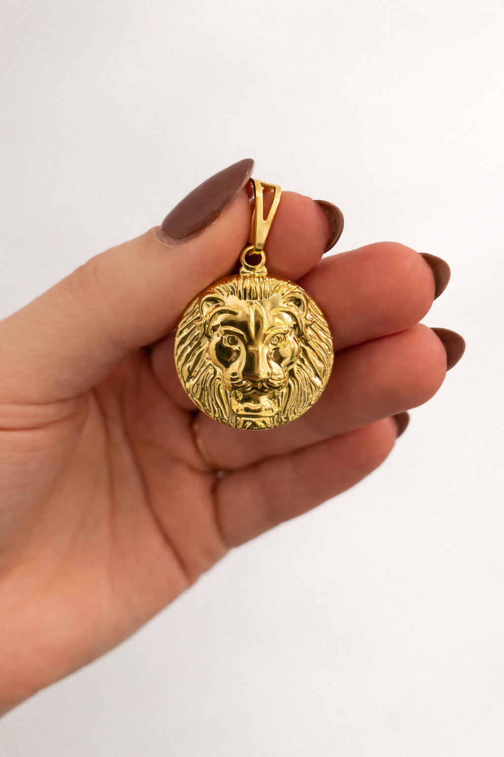 Pingente Leão em banho de ouro 18K redondo. Altura - 2,5cm.