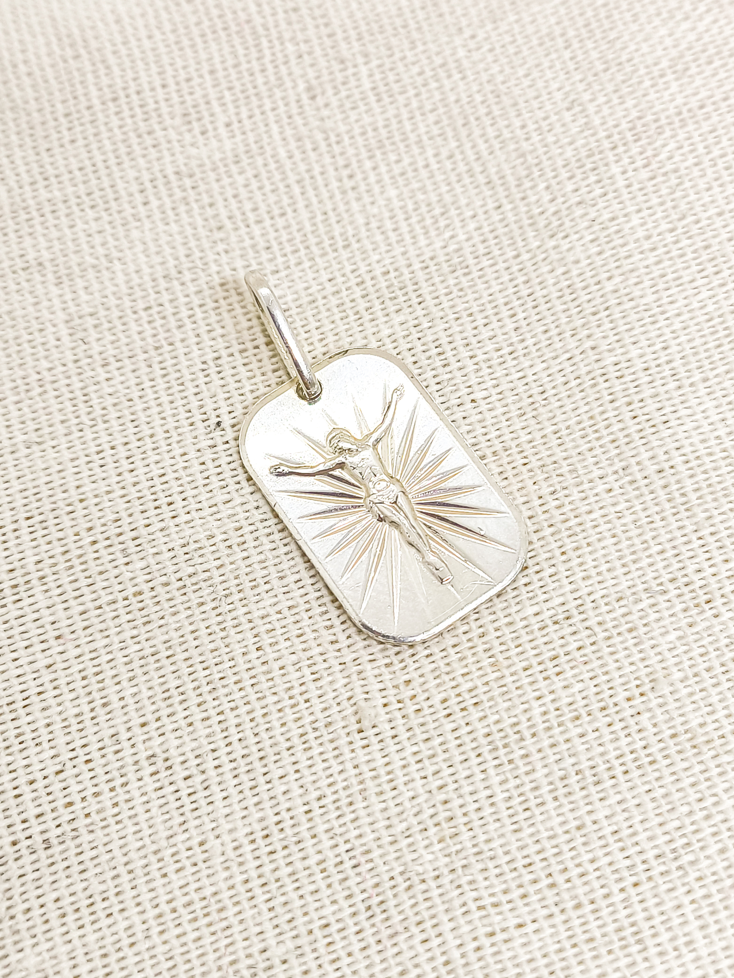 Pingente em prata 925, formato retangular com imagem de Cristo crucificado e irradiado. Tamanho: 2cm de altura, 1,4cm de largura.