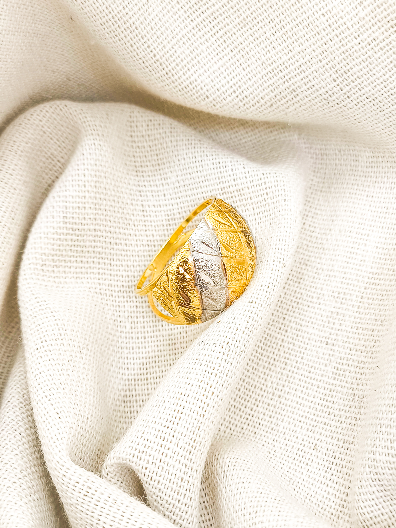 Anel em banho de ouro 18k, com frente chapa de ouro fosco e texturizado, com 2 fileiras em ródio branco.