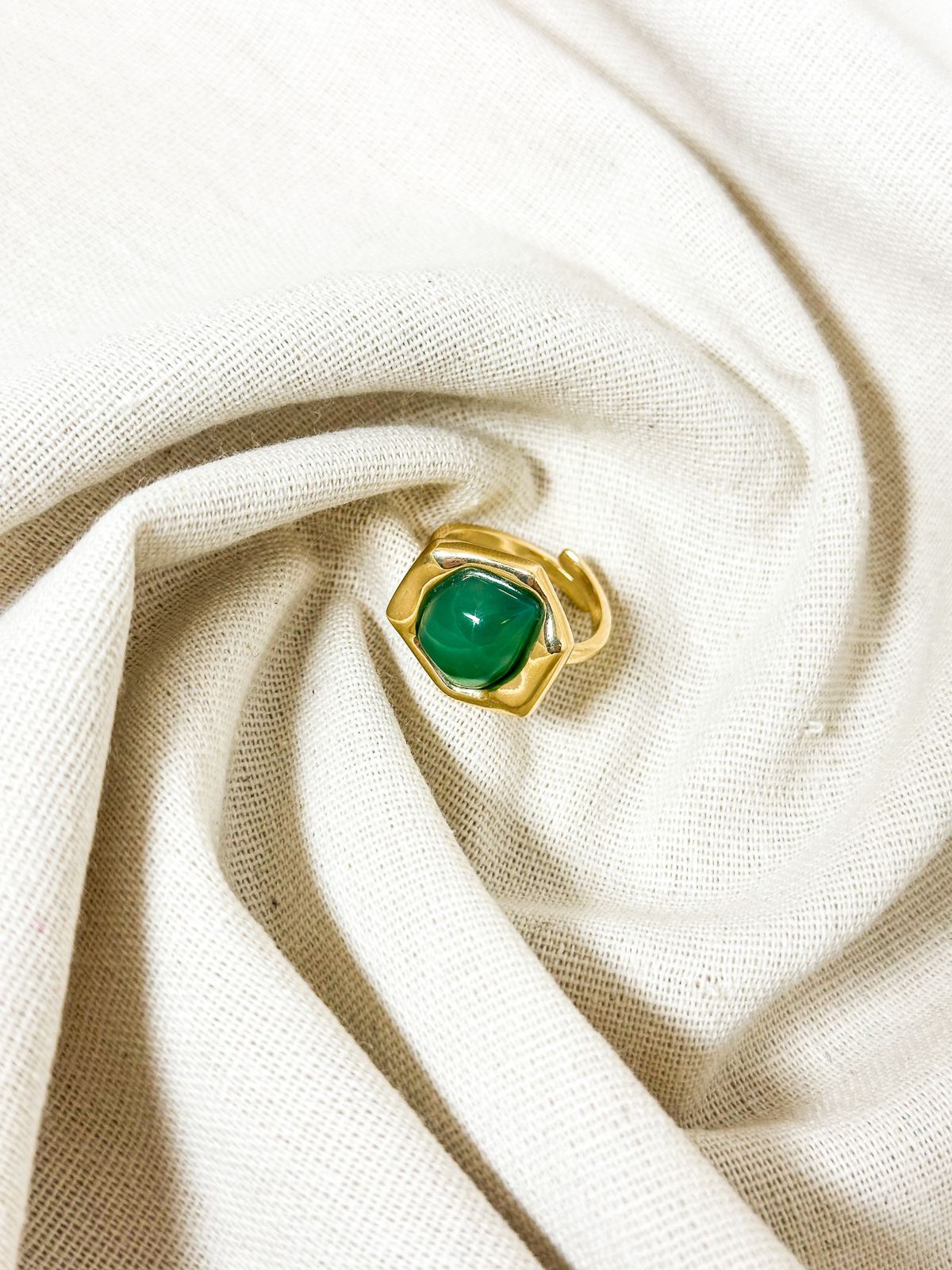 Anel em banho de ouro 18k, com pedra natural ágata verde 1 cm. Tamanho regulável.