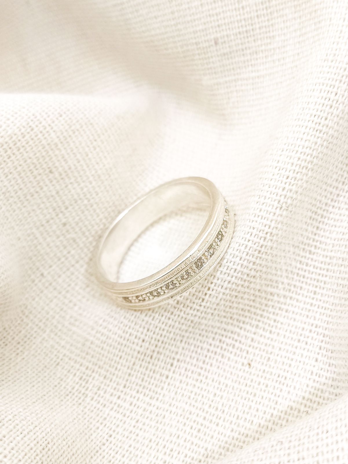 Anel aparador prata 925 com frente cravejada e detalhes de bolinhas na parte de trás.