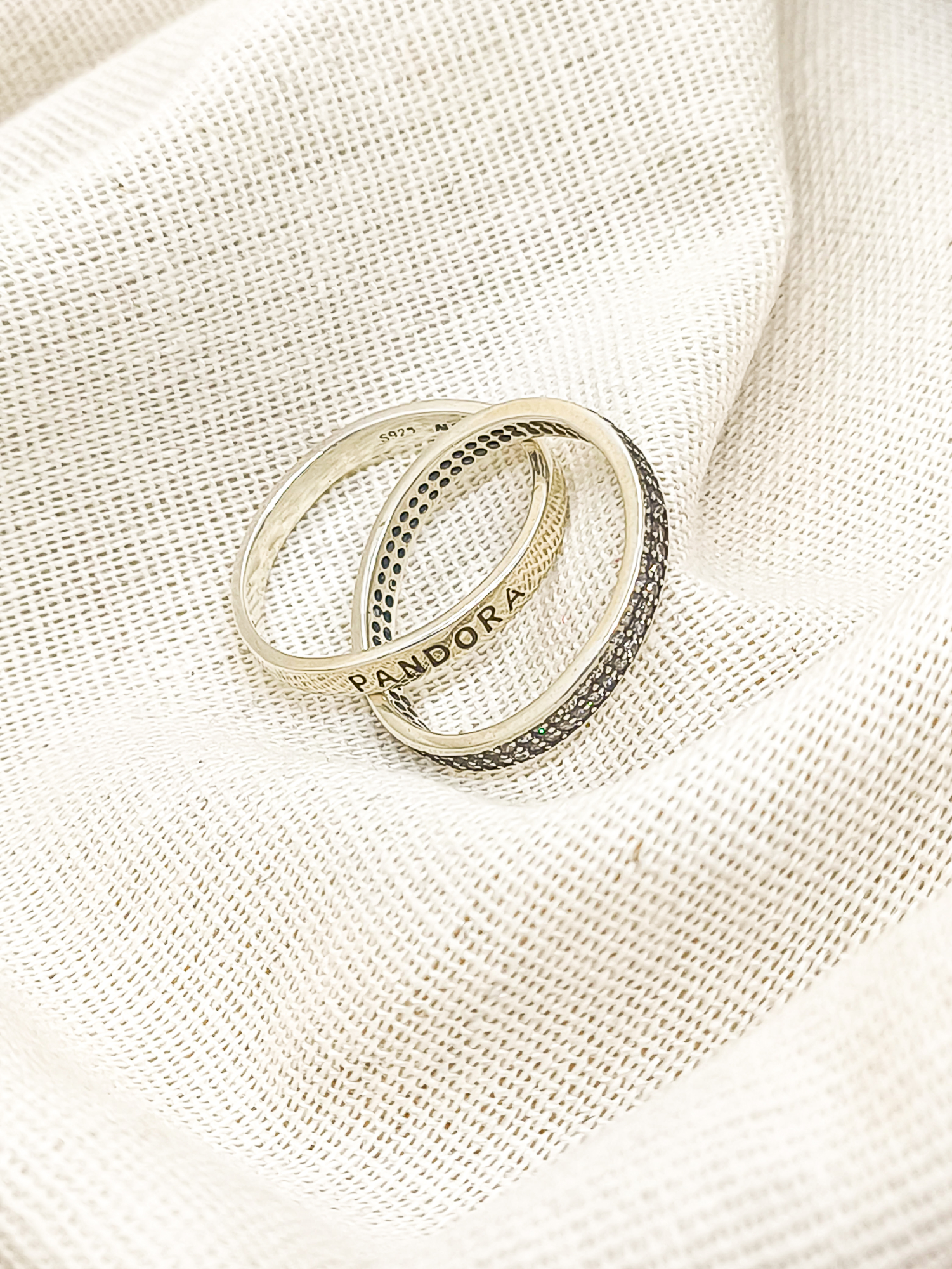 Anel duplo em prata 925, réplica de joia, sendo um aro liso e outro com 2 fileiras de micro cravação em zircônias brancas. Tamanho do aro: 0,3 cm de largura.