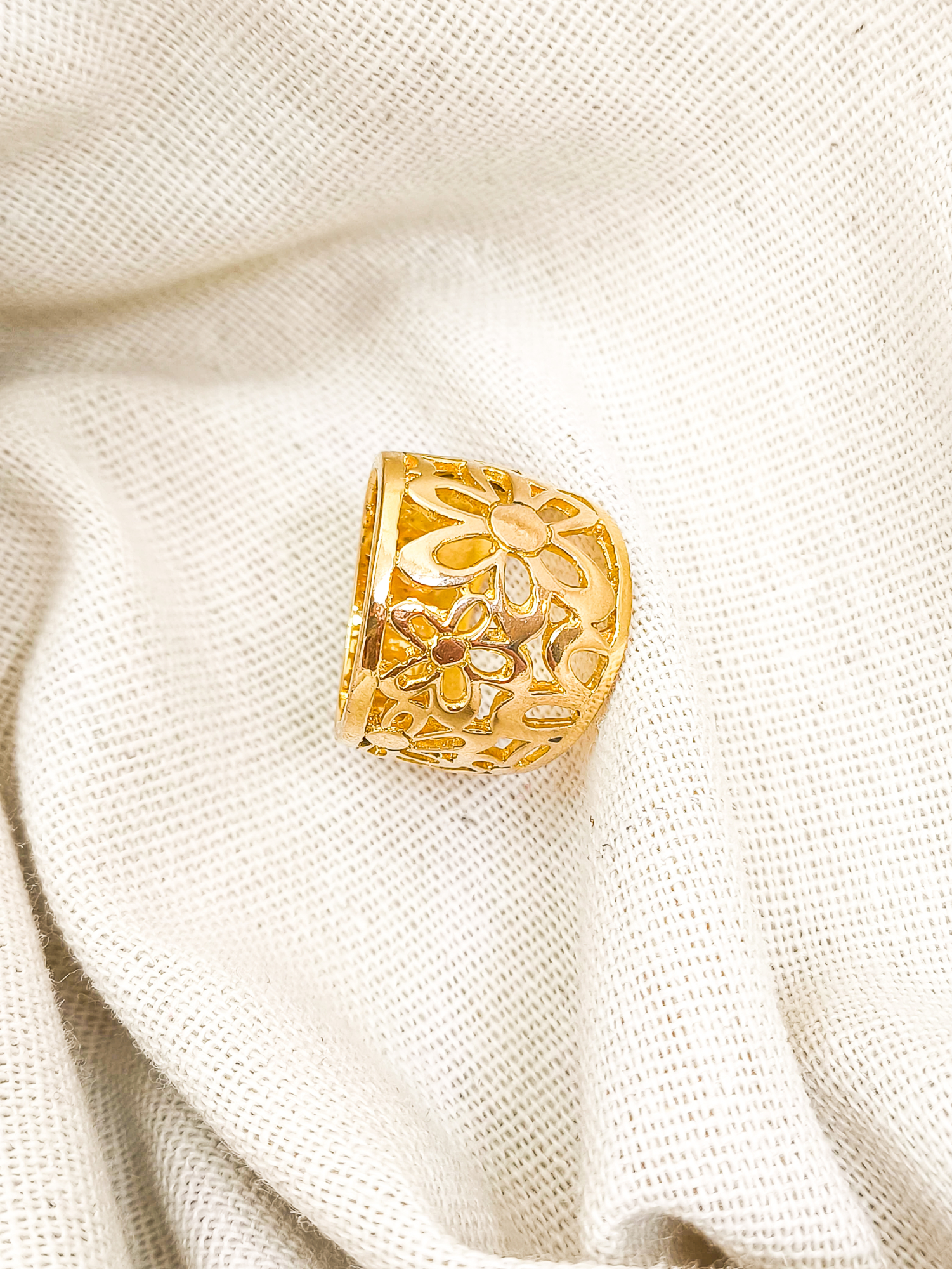 Anel em banho de ouro 18k, flores vazadas, assimétricas.
