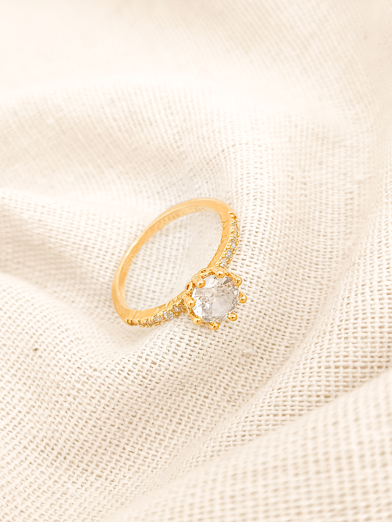 Anel solitário em banho de ouro 18K com pedra de zircônia central ( 7mm ) e aro cravejado.
