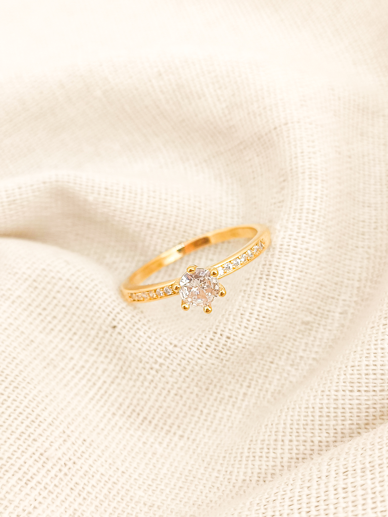 Anel solitário em banho de ouro 18K com aro cravejado e zircônia central alta de 5mm.
