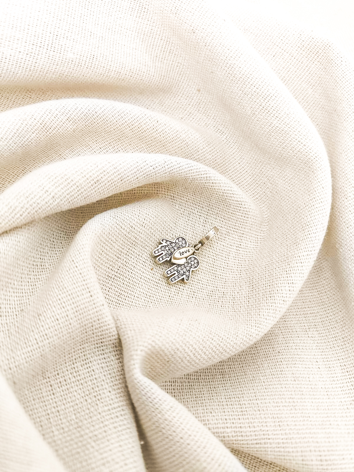 Berloque em prata 925, 2 meninos cravejados em zircônia com coração liso entre eles, com placa gravada love.