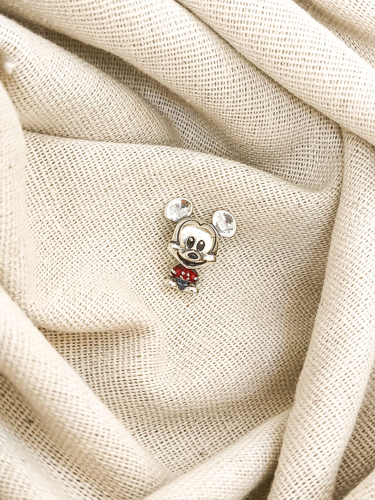Berloque Mickey em prata 925 com roupinha resinada em vermelho.