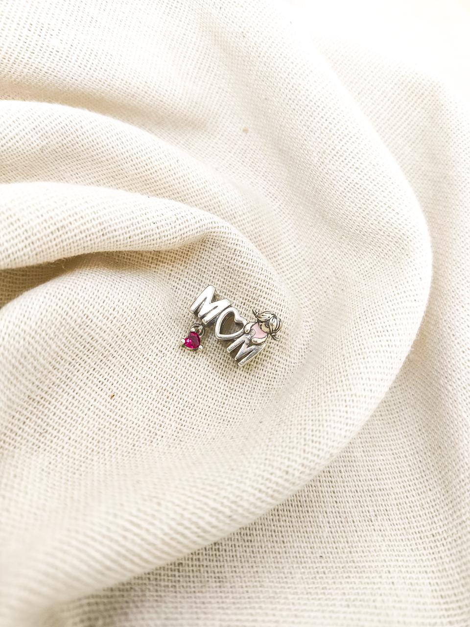 Berloque MOM em prata 925 com Bonequinha e Cristal Rosa suspenso.