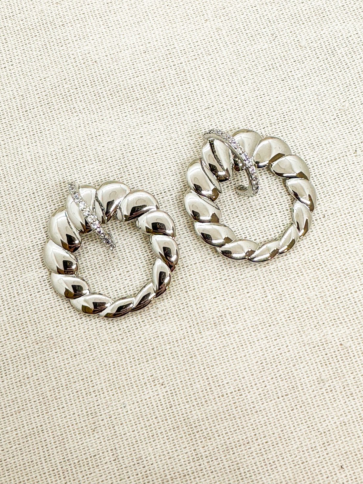Brinco pino rodinado esfera torcida com argola central cravejada.