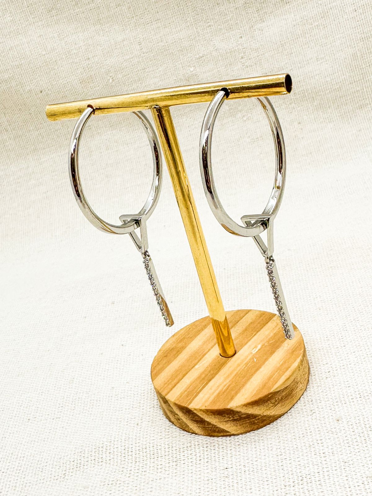 Brinco Argola Click em banho de ródio esfera com pendulo reto cravejado.