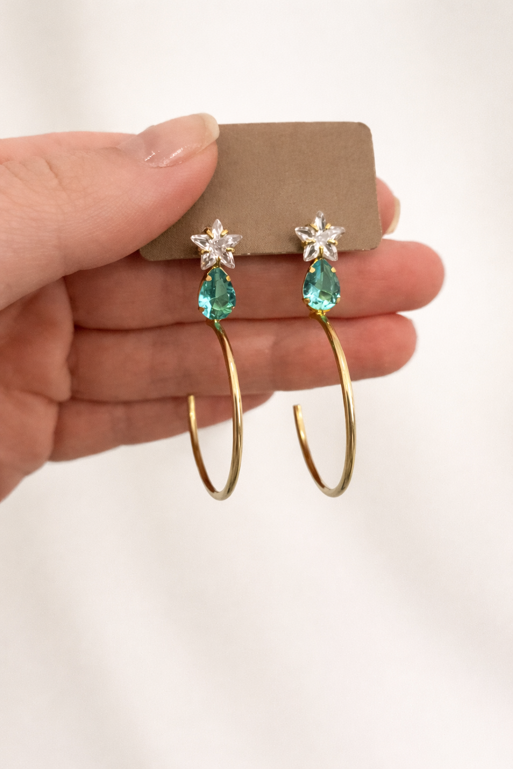 Argola em banho de de ouro 18K com pino fixo estrela de cristal e gota verde turmalina anexa a argola.