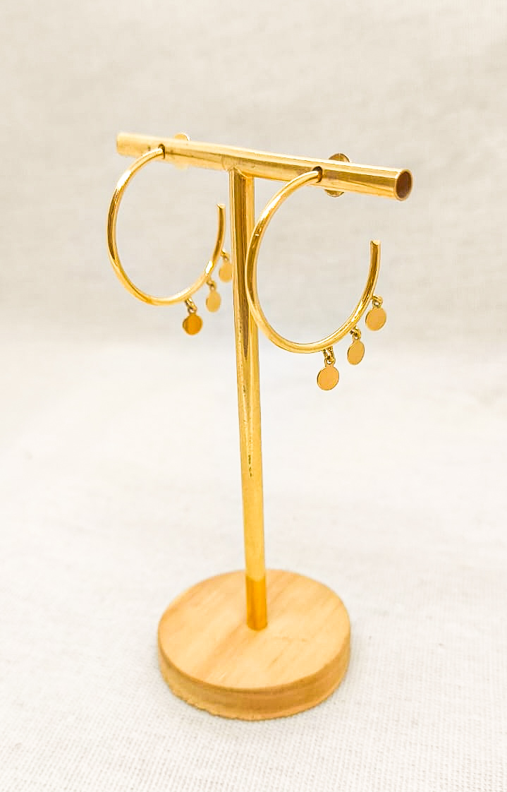 Brinco argola de pino em banho de ouro 18k com pingentes de mini medalhas.