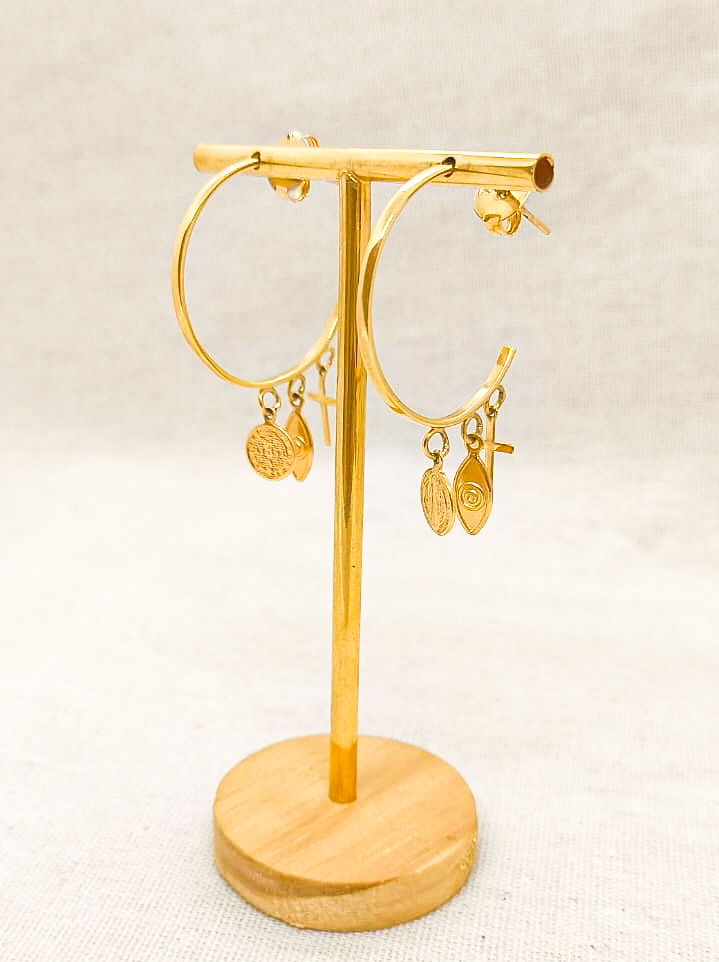 Brinco Argola em banho de ouro 18k, com pingentes de São Bento, olho grego e cruz.