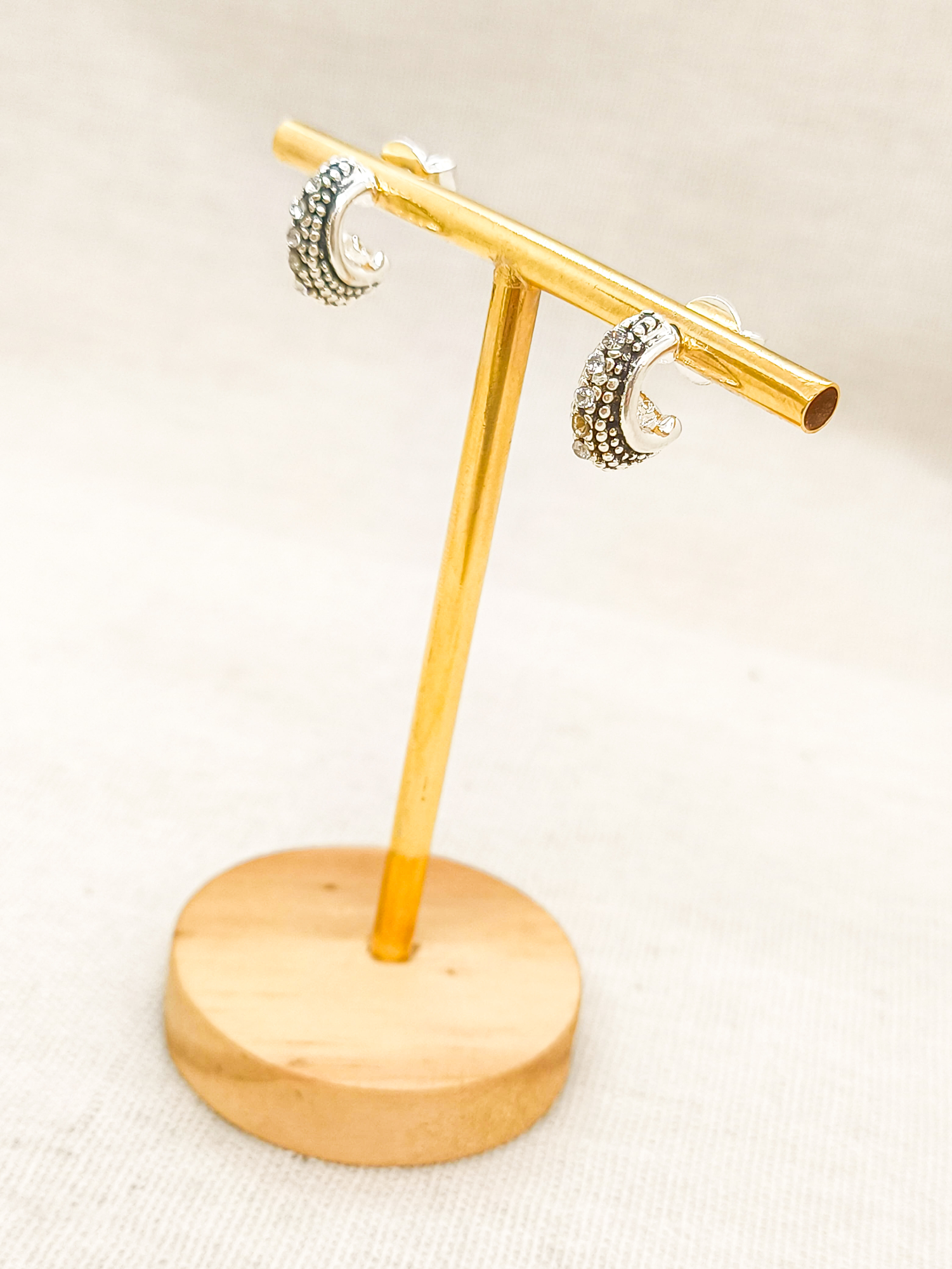Brinco argola em pino em prata leve, com textura de pipoca e 1 fileira de cravação. Altura: 11mm.