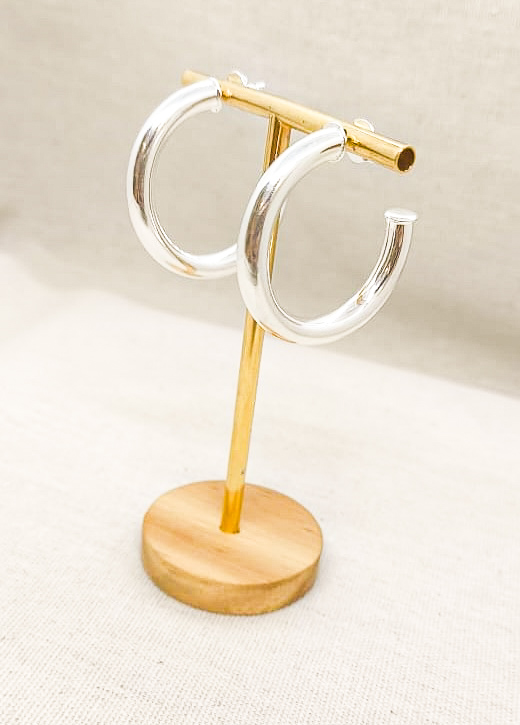 Brinco em prata leve, argola lisa de pino em tubo, 5mm de largura, 35mm de altura.
