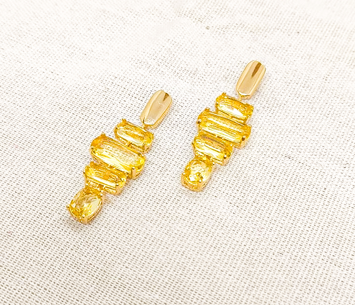 Brinco banho de ouro 18k, com base retangular lisa e escadas de 3 retângulos de cristais amarelo com acabamento de cristal oval.