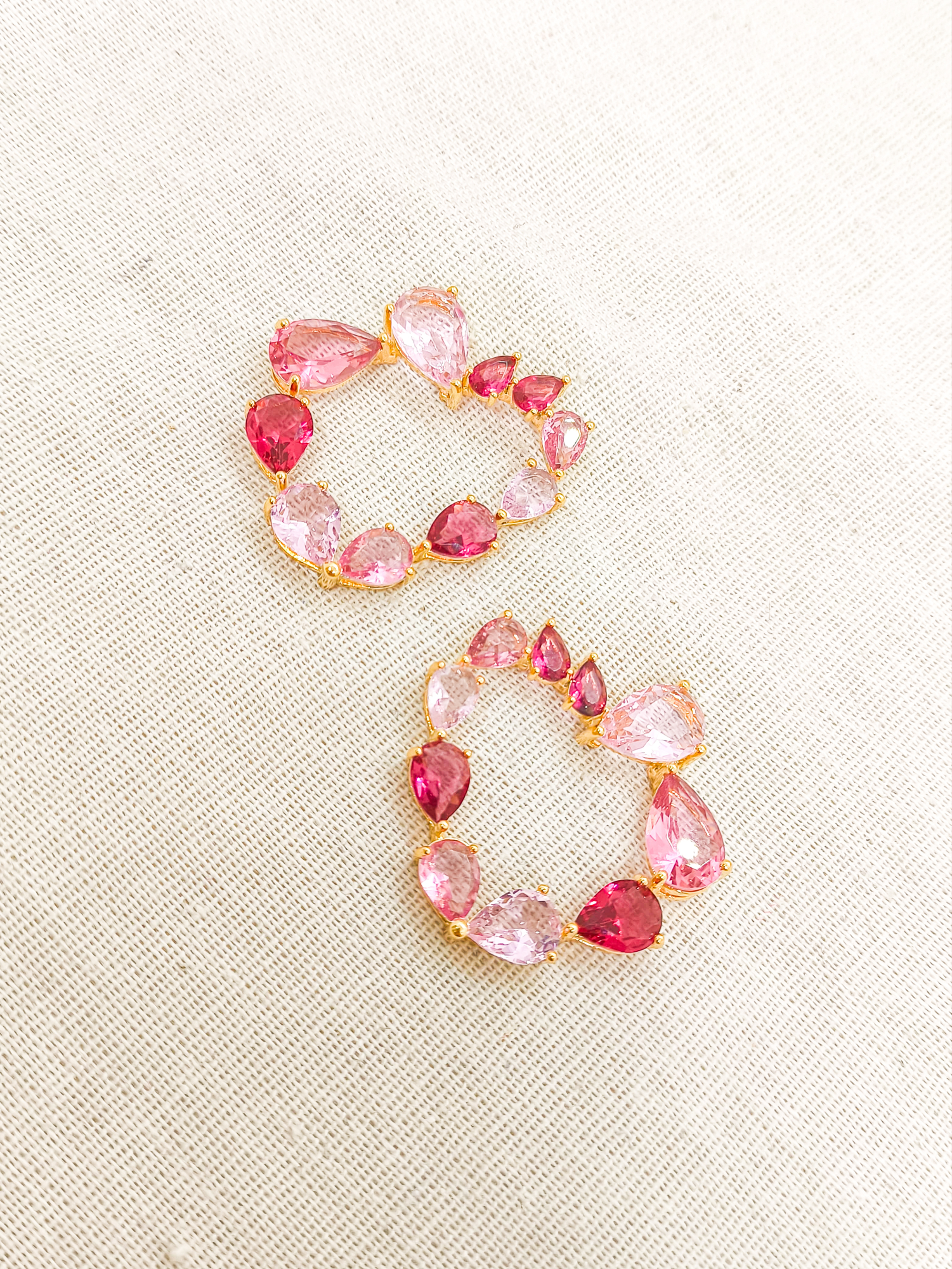 Brinco em bannho de ouro 18k, curvo com cristais rosa degradê.