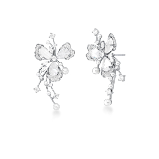 Brinco em banho de ródio branco formato de flor 3 pétalas de zircônia, com fundo de microcravação, com ramos de micropérolas.