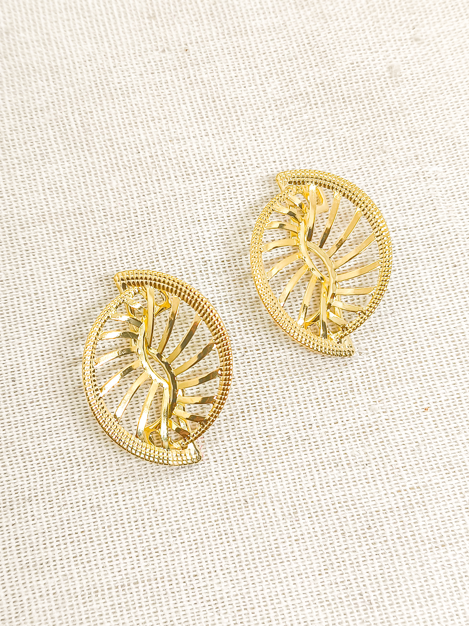 Brinco pino em banho de ouro 18K, leque vazado entrelaçado. Altura - 3cm // Largura - 2,1cm.