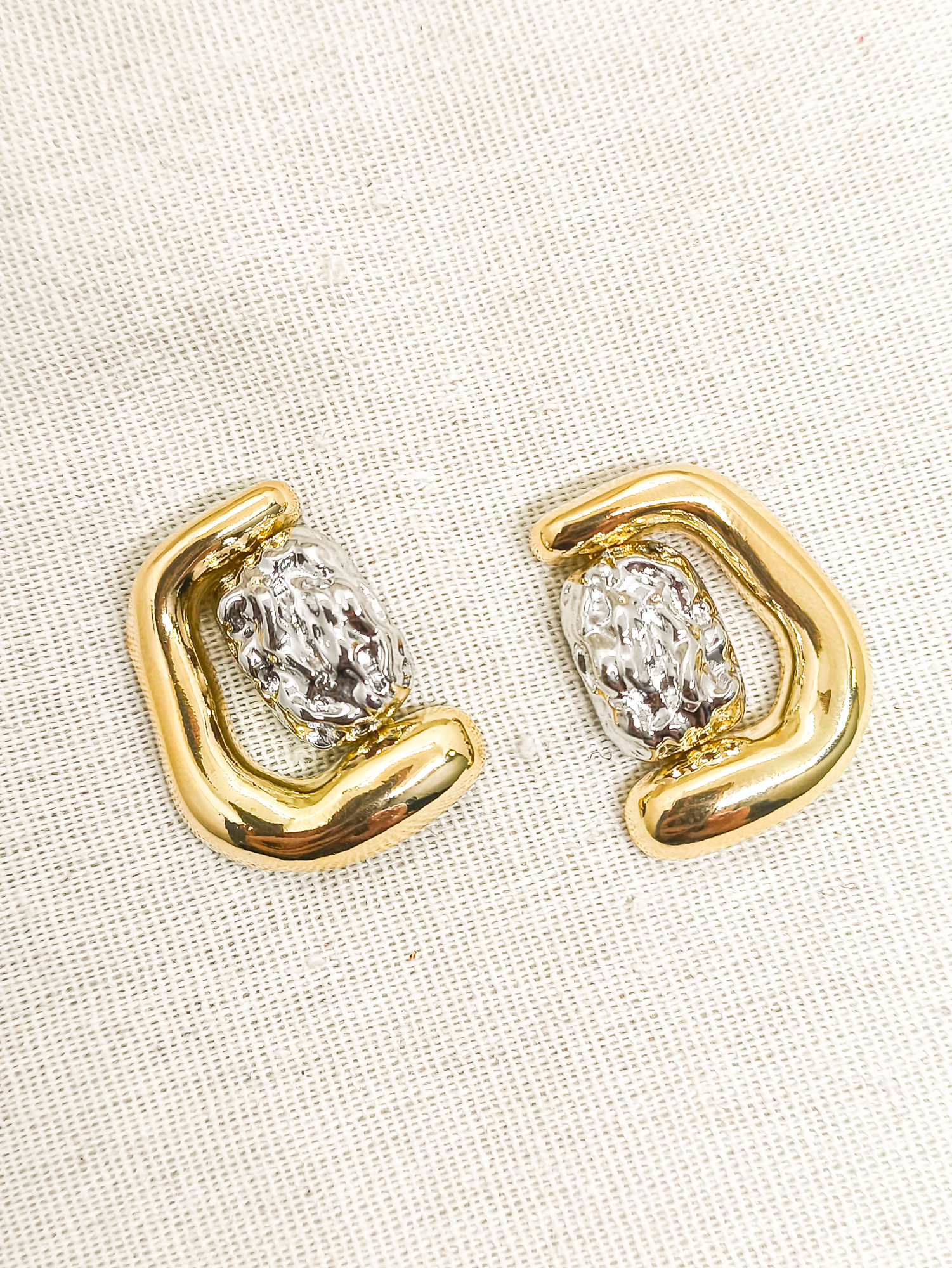 Brinco mix banhos ( ouro 18K + ródio ) orgânico com centro móvel texturizado.