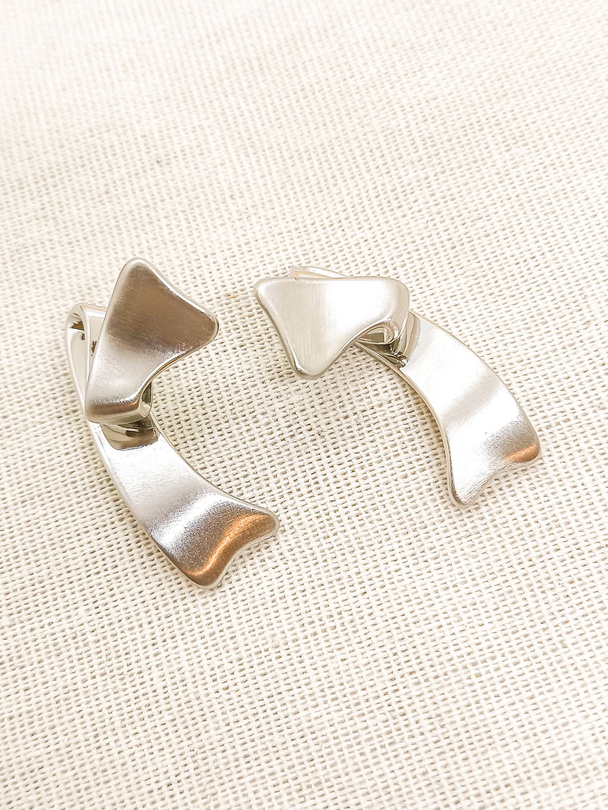 Brinco curvo liso acetinado, em banho de ródio branco.