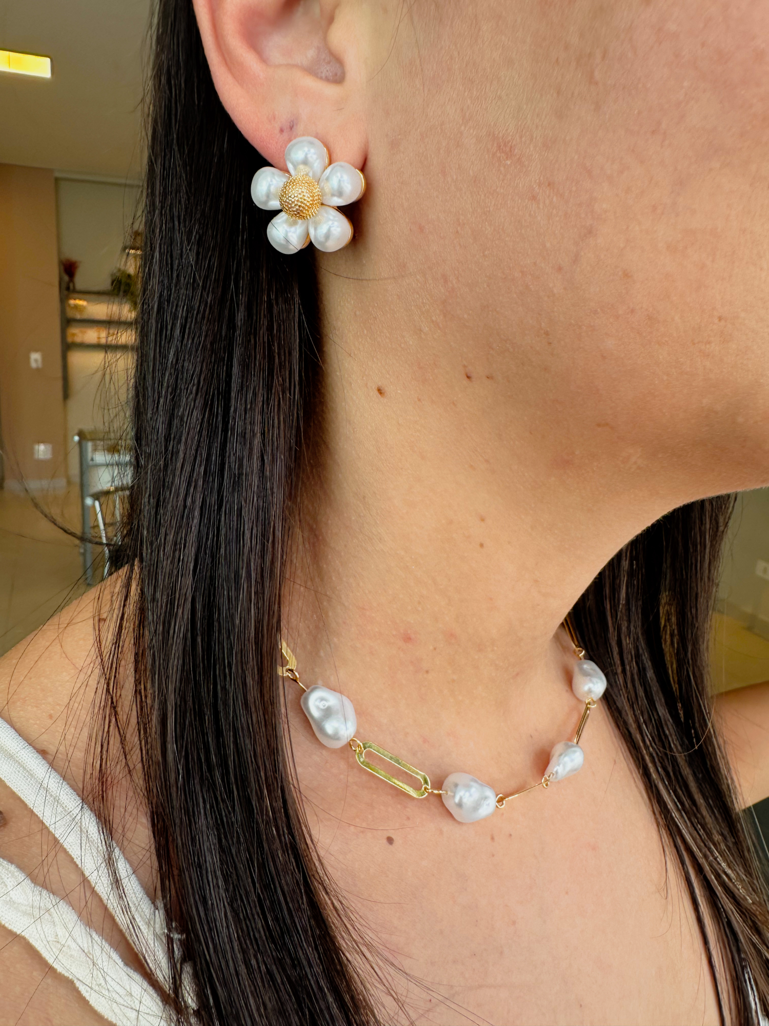 Brinco flor com pétalas em pérolas, em banho de ouro 18k.
