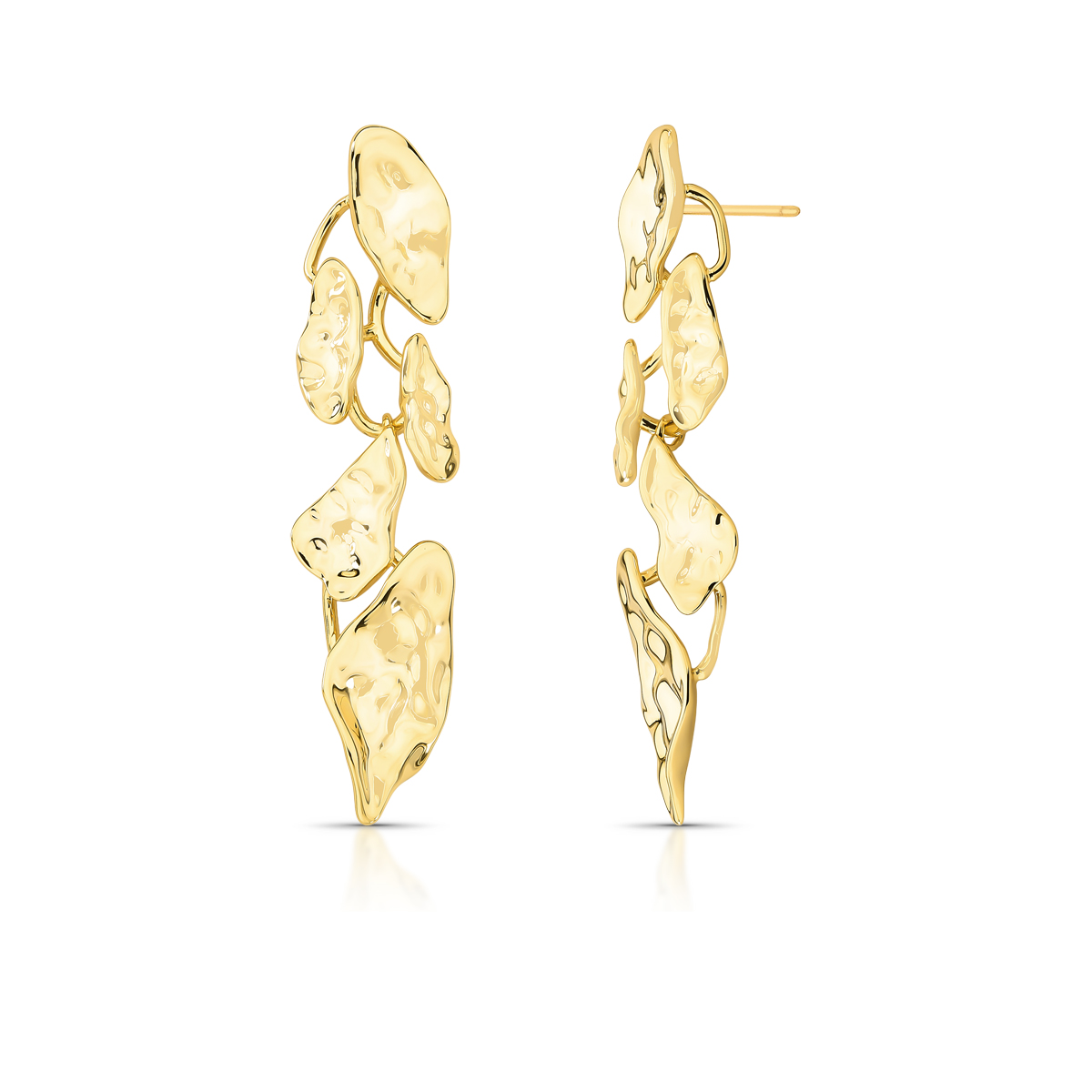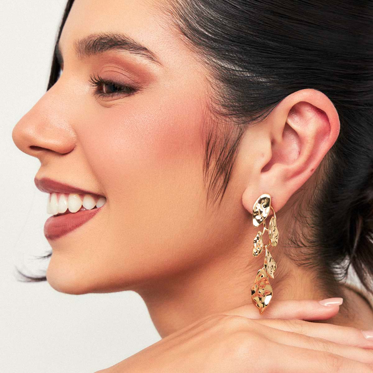 Brinco em banho de ouro 18 k, em formato de ramos de folhagens com folhas marteladas. Tamanho: 6 cm de altura.
