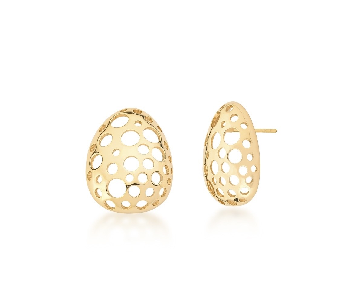 Brinco em banho de ouro 18k, liso oval maxi com vazado em bolas